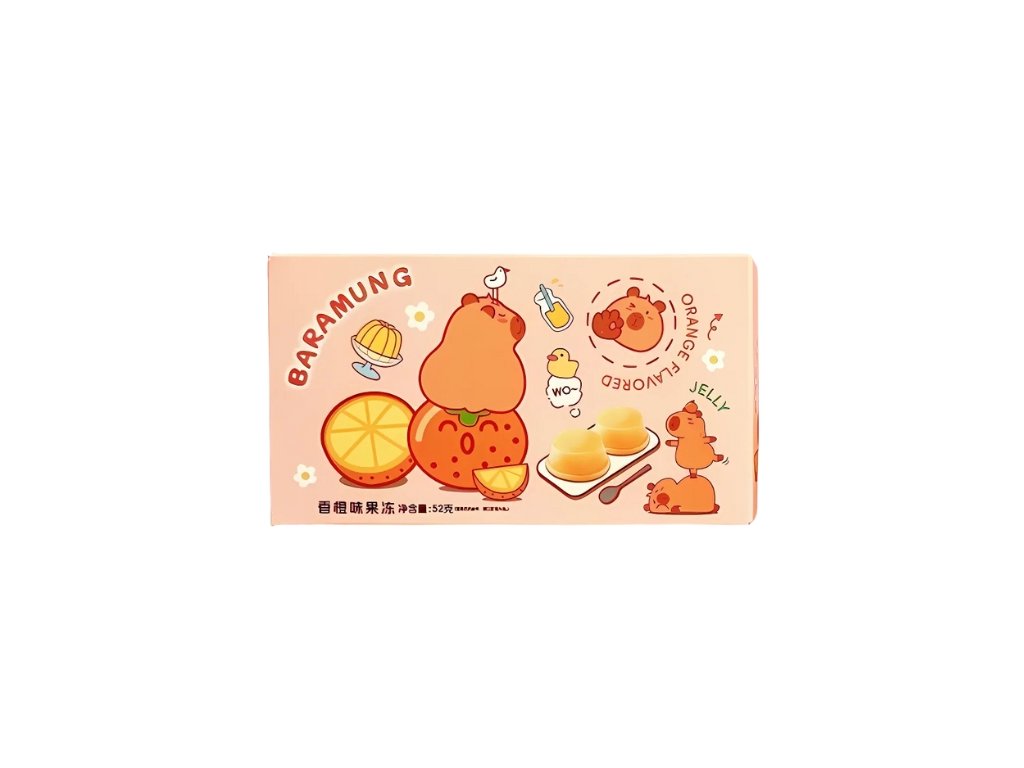Složení: Voda, fruktózo-glukózový sirup, bílý cukr, prášek z konjaku, potravinářské přídatné látky [zahušťovadla (E425, E407), regulátory kyselosti (E330, E296, E331, E332), barviva (E102, E110, E120), sladidlo (E955), konzervant (E202)], aroma.