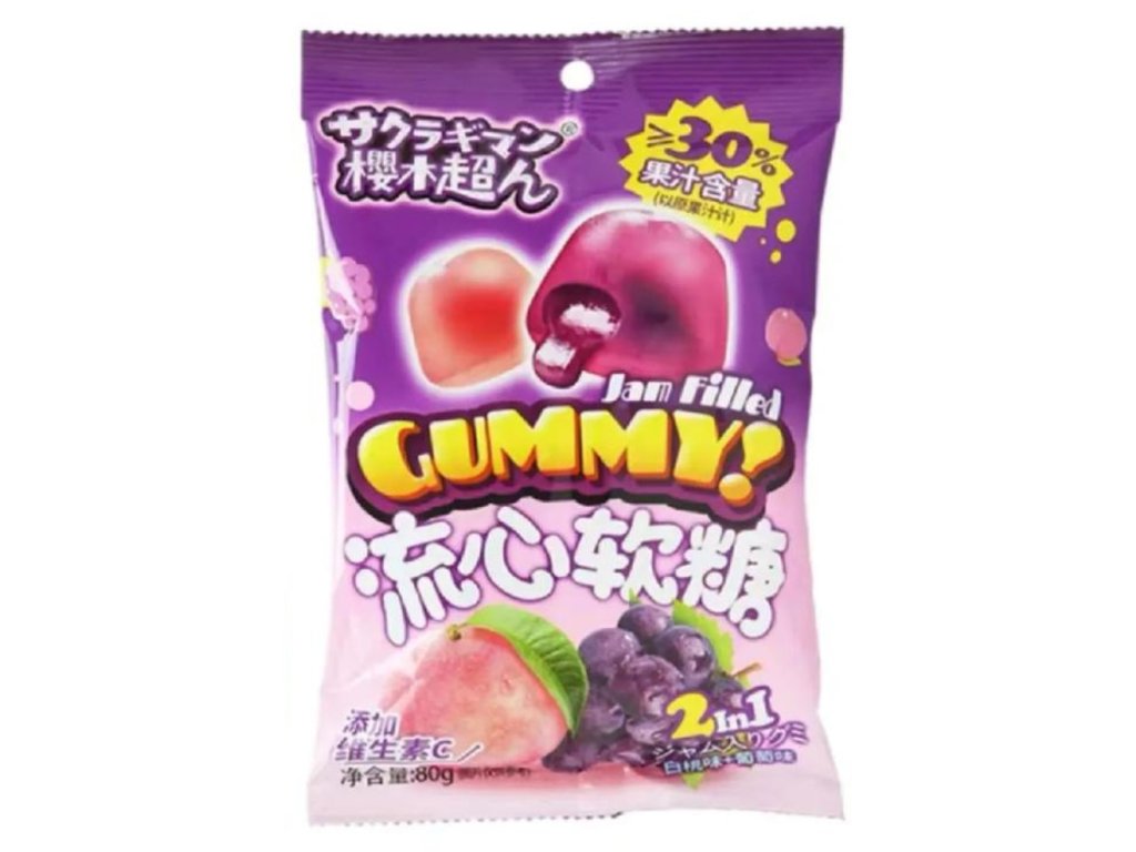 Ingredients: Grape flavour: Maltose syrup, white sugar, trehalose, water, concentrated grape juice (juice content ≥15%), concentrated apple juice (juice content ≥30%), sweetener (E420ii), gelatinizers (E407, E440), acidity regulators (E330, E296, E331), anti-caking agent (E903), rice paper powder, antioxidant (E300, 62 mg/100 g), colourants (E133, E120), flavouring. White peach flavour: Maltose syrup, white sugar, trehalose, water, concentrated white peach juice (juice content ≥15%), concentrated apple juice (juice content ≥30%), sweetener (E420ii), gelatinizers (E407, E440), acidity regulators (E330, E296, E331), anti-caking agent (E903), rice paper powder, antioxidant (E300, 62 mg/100 g), colourant (E129), flavouring.