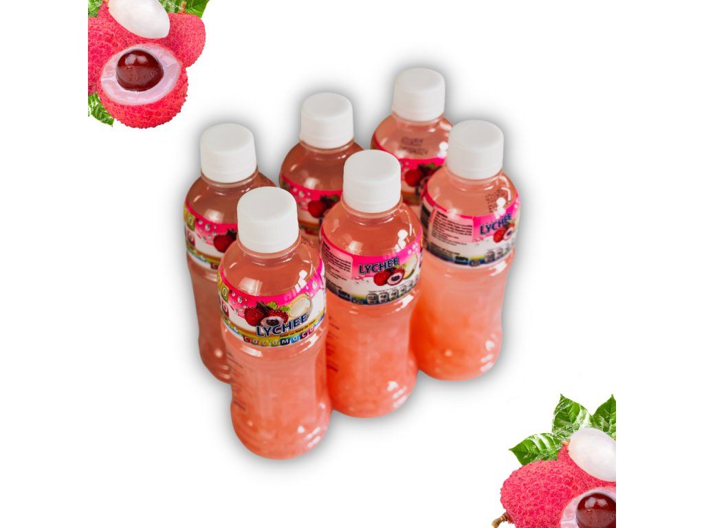 Složení: Voda, liči šťáva 25% (z koncentrované šťávy), nata de coco 25% (fermentovaná kokosová voda), cukr 6%, zvýrazňovač chuti (citrónová příchuť), konzervant; kyselina jablečná, benzoát sodný, regulátor kyselosti, sladidlo; cyklamát sodný, acesulfam K, barvivo E129..