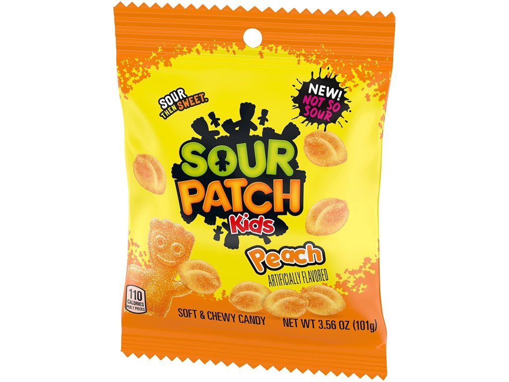 Želé bonbóny obalené v kyselém cukru s broskvovou příchutí.