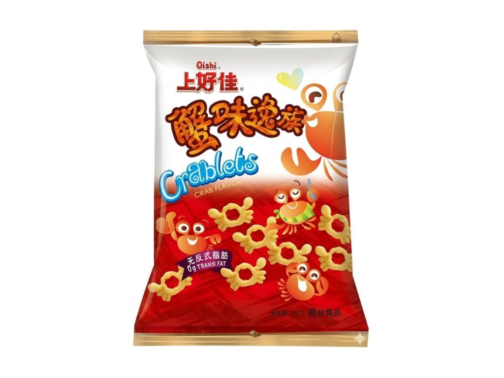 Ingredients: Wheat flour, vegetable oil, potato starch, corn starch, compound seasonings (sugar, salt, maltodextrin, anti-caking agents (E170, E551), soy sauce powder, flavouring, crab powder seasoning (contains crab), fish sauce powder, yeast extract, flavour enhancer (E635)), tapioca starch, sugar, crab meat powder seasoning (contains crab), salt, crab powder seasoning (contains crab), shrimp, emulsifier (E471), colorant (E124), anti-caking agent (E170), flavouring, yeast extract.