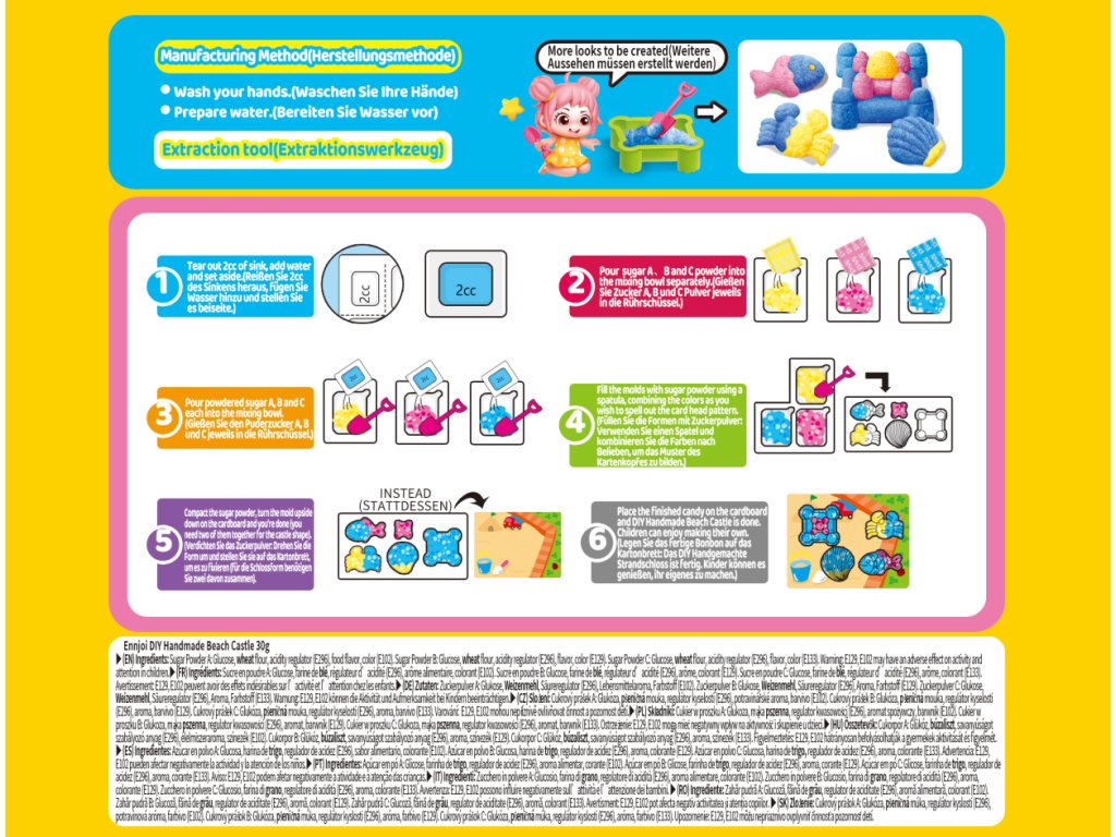 Ingredients: Sugar Powder A: Glucose, wheat flour, acidity regulator (E296), food flavor, color (E102). Sugar Powder B: Glucose, wheat flour, acidity regulator (E296), flavor, color (E129). Sugar Powder C: Glucose, wheat flour, acidity regulator (E296), flavor, color (E133).
