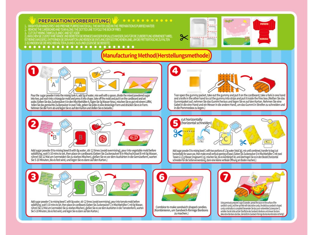 Ingredients: Sugar powder A: sugar, lactose, pregelatinized starch, wheat flour, whey powder, food flavor. Sugar powder B: edible glucose, sugar, lactose, thickeners (E1442, E401, E415), acidity regulator (E297), food flavor, colours (E170, E129). Sugar powder C: edible glucose, sugar, lactose, thickeners (E1442, E401, E415), colour (E170), acidity regulator (E297), food flavor, colors (E102, E133). Sugar powder D: edible glucose, sugar, thickeners (E1422, E415), lactose, skimmed milk powder, food flavor. Decorative candy: sugar, glucose, corn starch, glucose syrup, colors (E102, E110, E133, E129).