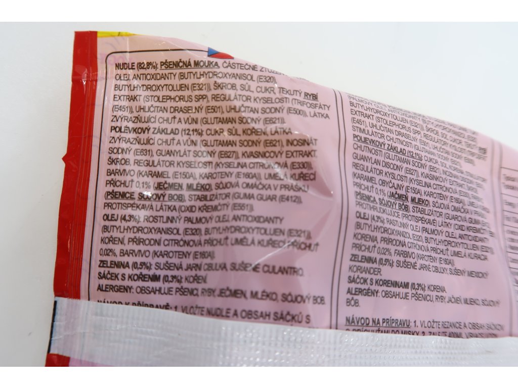 Složení: nudle: pšeničná mouka, částečně ztužený rostlinný palmový olej, škrob, sůl, cukr, rybí extrakt (sardele), stabilizátor (E451i), kypřící látka (E501), uhličitan sodný (E500), antioxidant butylhydroxyanisol (E320), antioxodant butylhydroxytoluen (E321), glutamát sodný (E621)