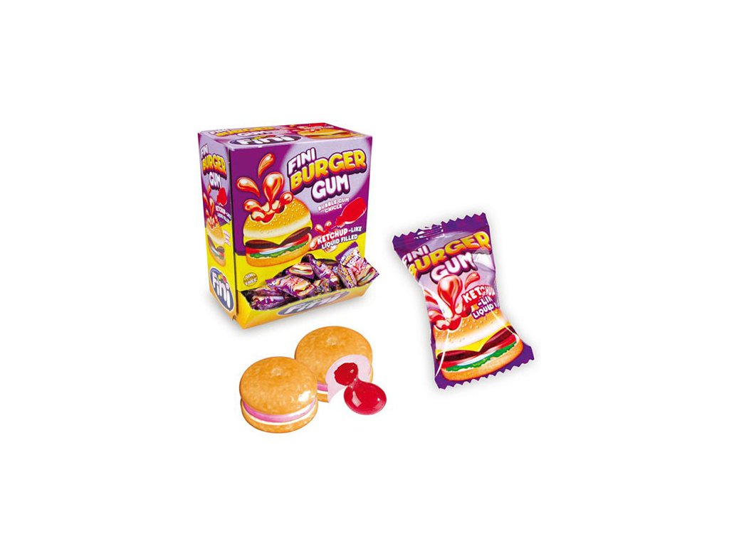 Žvýkačka ve tvaru hamburgeru s tekutou červenou náplní