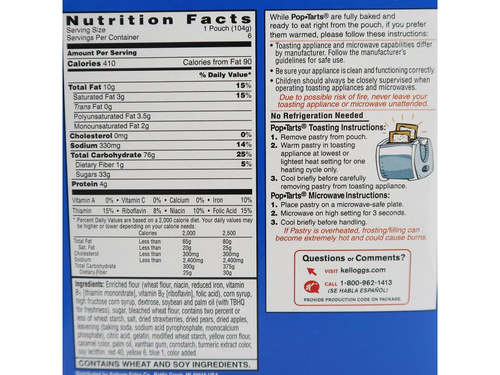 Složení: obohacená mouka (pšeničná mouka, niacin, redukované železo, vitamín B1 (thiamin mononitrát), vitamín B2 (riboflavin), kyselina listová), kukuřičný sirup, kukuřičný sirup s vysokým obsahem fruktózy, dextróza, sójový a palmový olej (s terciálním butylhydrochinonem pro zachování čerstvosti), cukr, bělená pšeničná mouka, obsahuje 2% či méně: pšeničný škrob, jedlá sůl, sušené jahody, sušené hrušky, sušená jablka, kypřící látky (uhličitan sodný, kyselý pyrofosforečnan sodný, fosforečnan vápenatý), kyselina citrónová, želatina, modifikovaný pšeničný škrob, žlutá kukuřičná mouka, karamelová barva, xanthanová guma, kukuřičný škrob, extrakt kurkumy (barvivo), sójový lecitin, umělá barviva (Červeň Allura AC, Brilantní modř FCF, Žluť SY)