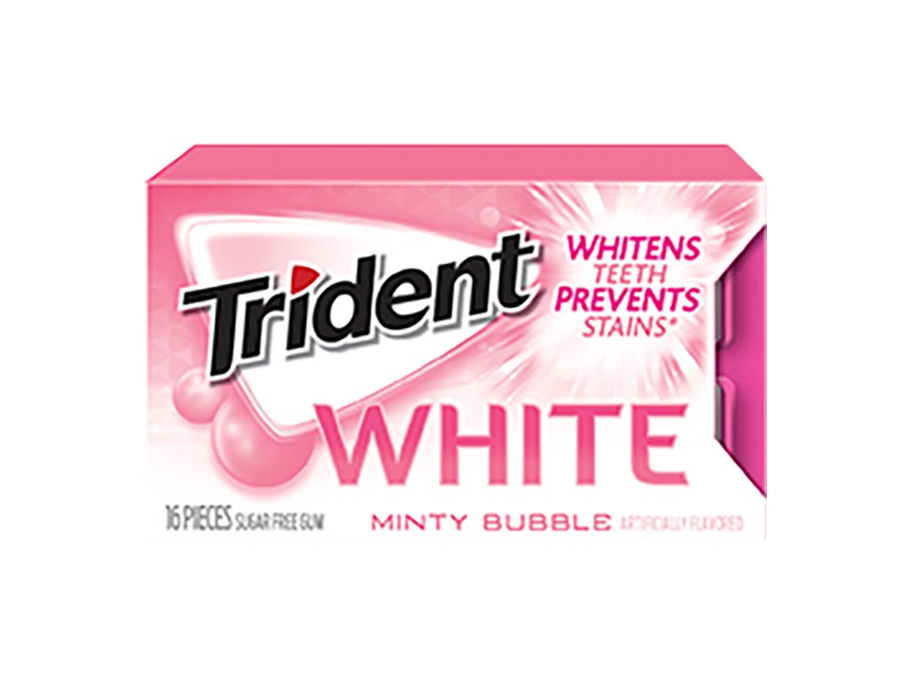 Žvýkačky bez cukru TRIDENT White Minty Bubble Flavor osvěžují dech o 30 % méně kalorií než žvýkačky s cukrem a pomáhají bělit zuby již za 4 týdny.