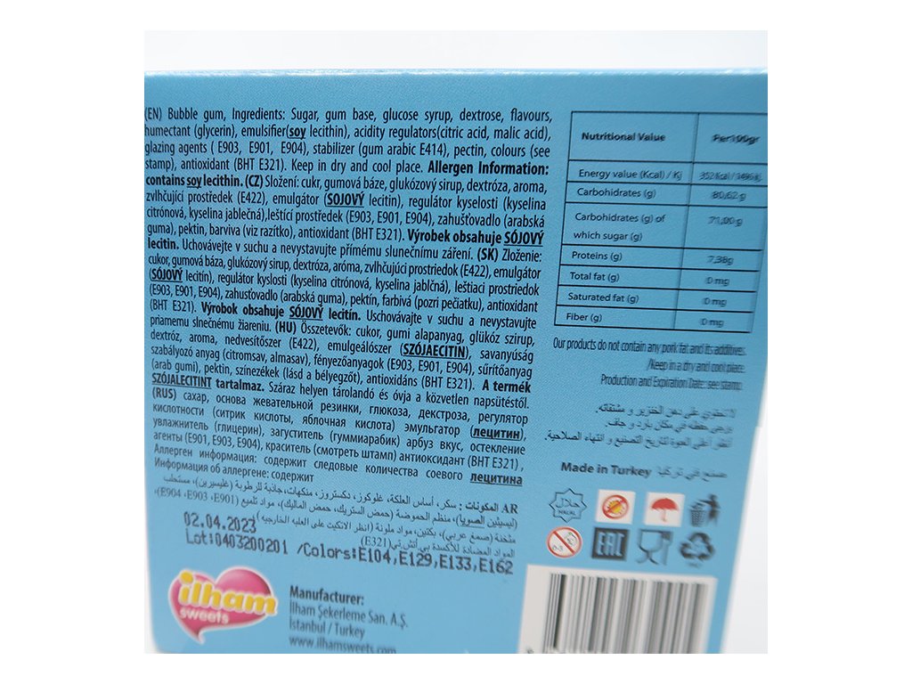 Složení: cukr, gumová báze, glukózový sirup, dextróza, aroma, zvlhčující prostředek (E422), emulgátor (sójový lecitin), regulátor kyselosti (kyselina citronová, kyselina jablečná), leštící prostředek (E903, E901, E904), zahušťovadlo (arabská guma), pektin, barviva, antioxidant (BHT E321