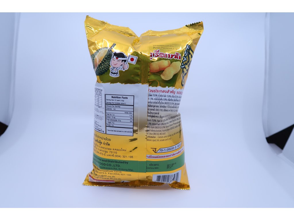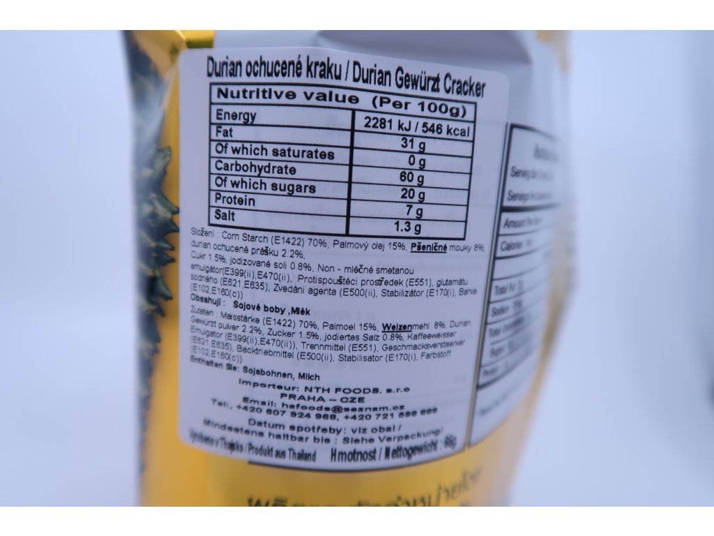Složení: kukuřičný škrob, palmový olej, pšeničná mouka, durian prášek, cukr, jodizovaná sůl, emulgátor (E399(ii), E470(ii)), protispékavá látka (E551), zvýrazňovač chuti (E621, E635), kypřící látka (E500(ii)), stabilizátor (E170(ii)), barvivo (E102, E160(c))