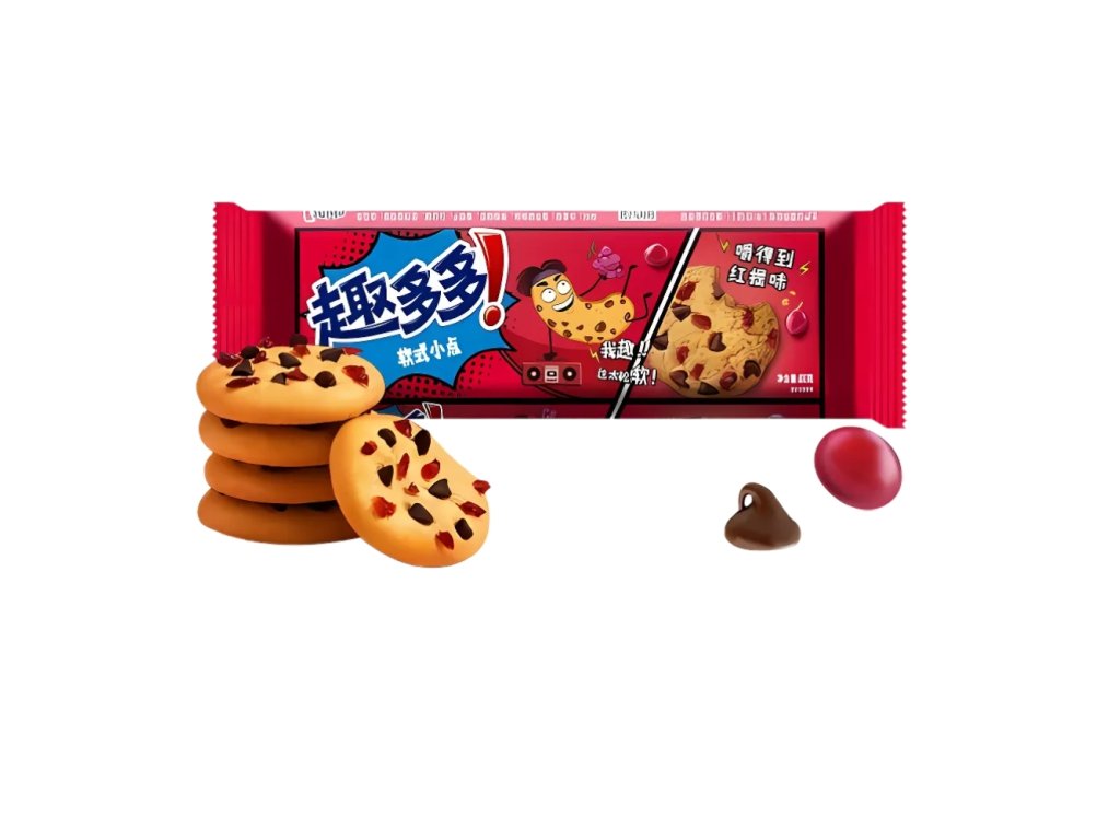 Složení: pšeničná mouka (minimálně 33%), rostlinný olej, potravinářské přídatné látky [zahušťovadlo (E1442), emulgátor (E422, E481), sladidlo (E420ii), regulátor kyselosti (E500ii, E503ii), barvivo (E160b)], rozinky (minimálně 10%), glukózový sirup, dextróza, čokoládové kousky s náhradou kakaového másla (sójový lecitin) (minimálně 3%), bílý cukr, maltodextrin, syrovátkový prášek, sůl, aroma.