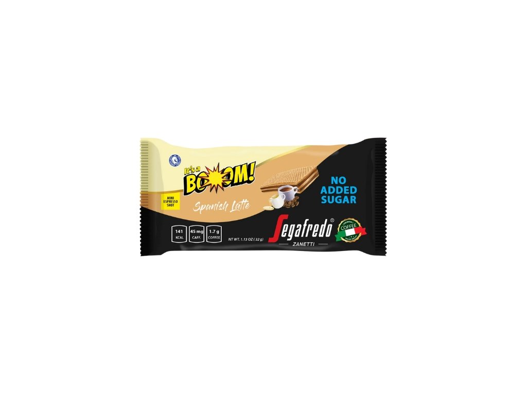Složení: Náplň s příchutí latté [sladidlo (E965), palmový olej, 12 % plnotučné mléko v prášku, 5,25 % kávového prášku, aroma, emulgátor (sojový lecitin), sůl], vafle [pšeničná mouka, palmový olej, emulgátor (sojový lecitin), kypřicí látka (E500), sůl].