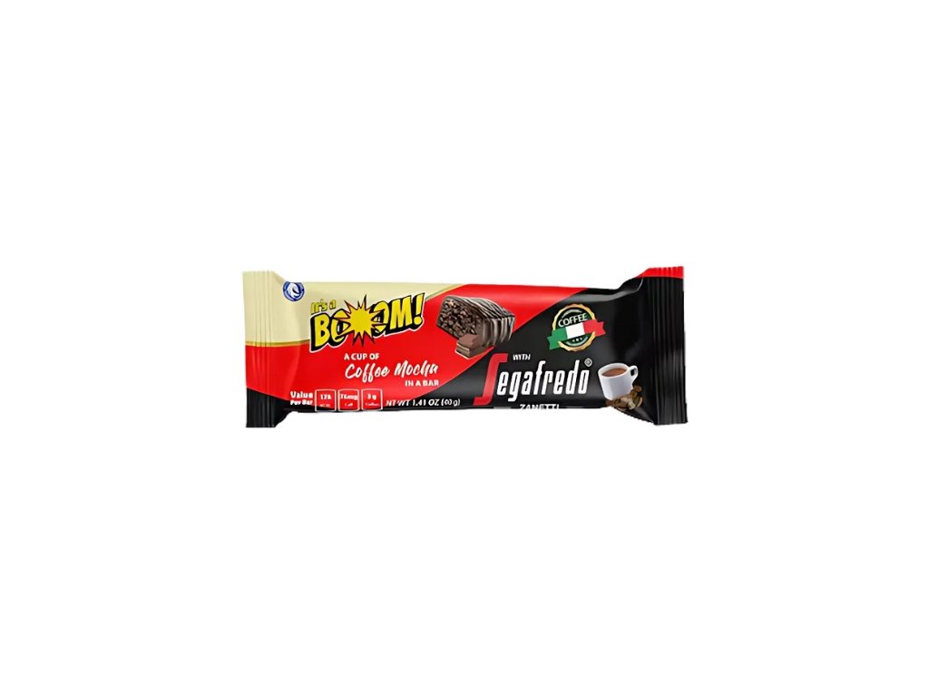 Tyčinka s kávou, pufovanou rýží a kousky kakaové fantazie, obalená vrstvou s čokoládovou příchutí